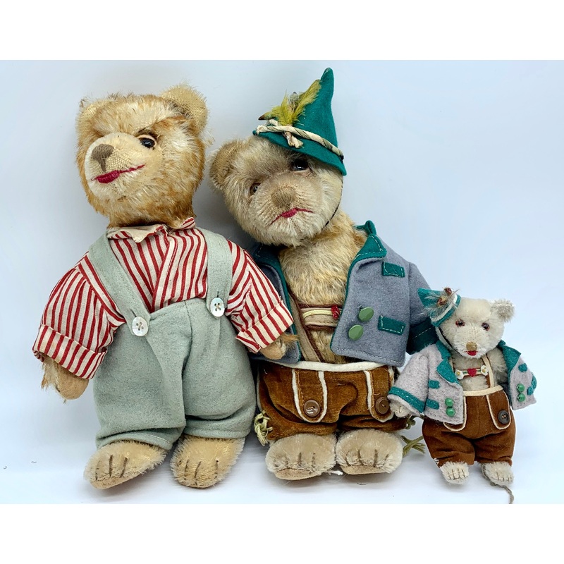 This Eduard Cramer Bearkin group Shows Ed a larger Bearkin and two 9 ins smaller ones together with the tiny artist bear by Elizabeth Leggat. They have flat standing feet and pads and the familiar stitched nose and mouth Description Date 1930 Make Eduard C