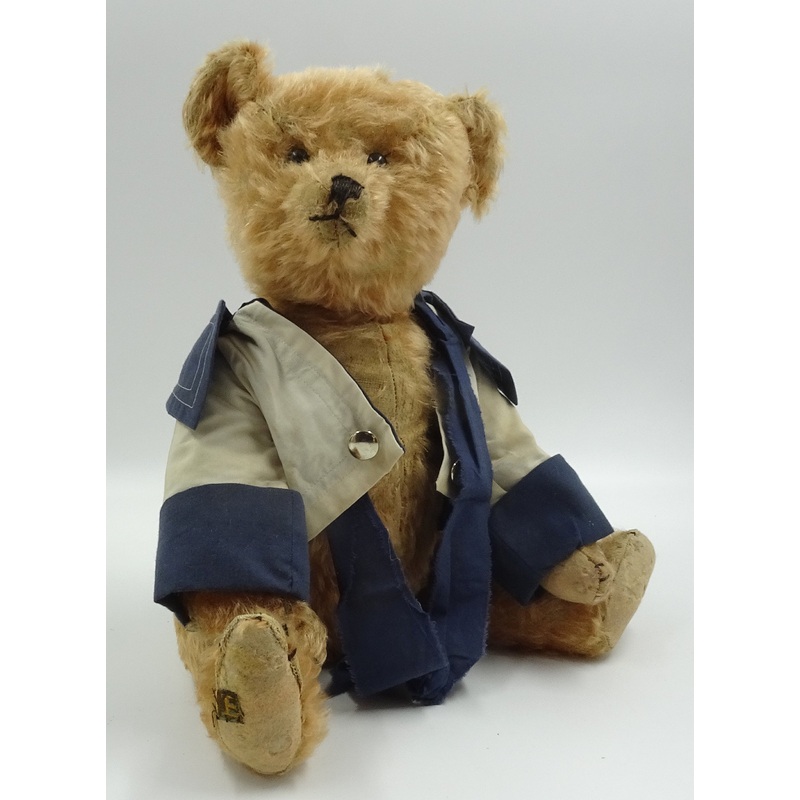 Antique American 16″ BMC Apricot Bear c 1907, Mr Bruin. He has apricot mohair and a piece of his BMC label on his foot pad. These bears were only made for a short period of time around 1907. Mr Bruin has the following Bruin Manufacturing Company features: Small rounded ears set wide apart on head give a fox-like appearance, shoe-button eyes, five claws (few missing on foot), vertically stitched nose, long arms, felt pads and large oval feet. Combination of excelsior and kapok with non-working squeaker. The quality of this bear measures that of Steiff however, he is even more rare.