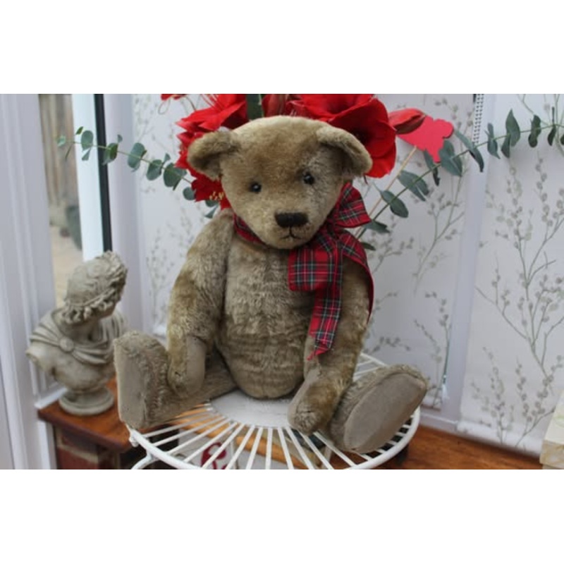 This early 1907 Harman teddy bear has shoe button eyes, golden brown zigzag cloth nose, which appears to be original, three golden brown claws on feet (pads appear to be original) and the hands point upwards in good condition.He's all original 22" and fab