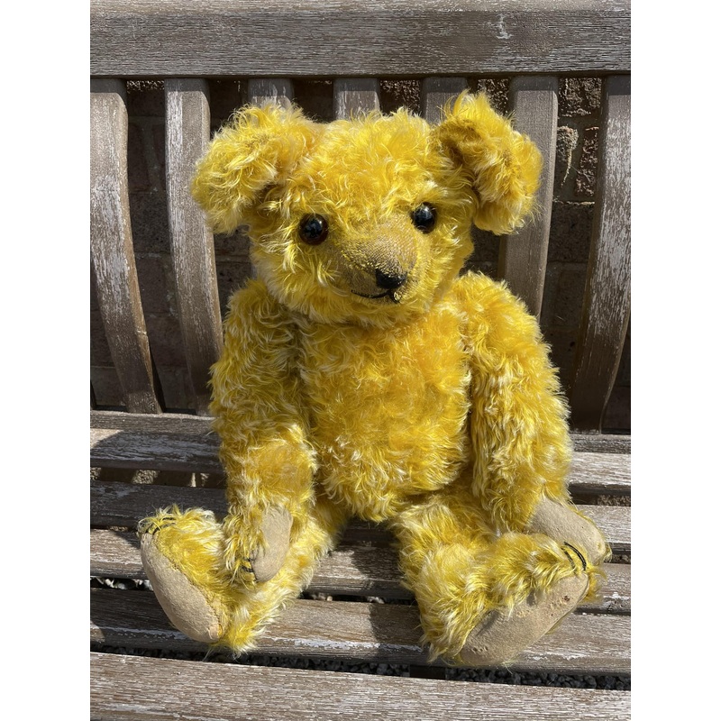 A large musical Pappe Moritz (or Jopi?) bear in fantastic yellow tipped mohair. Standing 20 tall with original pads with minor holes. All joints work glass eyes are replacements. Squeeze his bellow movement and he plays a tune.. 80% mohair cover most loss