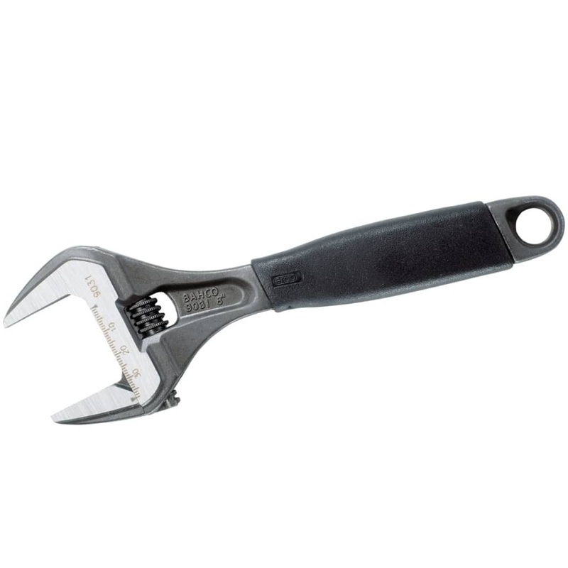 This adjustable wrench 9031 from BAHCO is made of precision-hardened steel with a black, corrosion-resistant finish. Thanks to the slim head with tapered jaws it can be used in confined spaces. There is a measurement scale on the wrench head for pre-adjust
