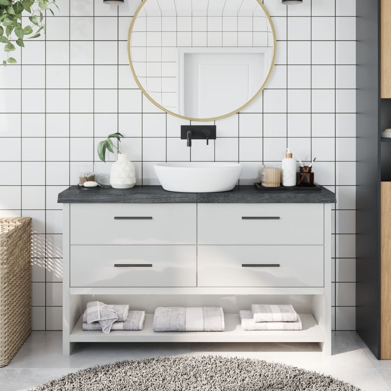 Are you planning to renovate your countertops at home? This wooden bathroom countertop is a perfect choice! Durable construction: This bathroom worktop is made of solid oak wood, which is a beautiful natural material. Oak wood has a medium brown colour and a dense grain, contributing to its unique look. Due to the hinge design, it can be folded and stored in narrow spaces.Versatile applications: Besides a bathroom vanity top, this wooden countertop can be combined with different bases according to your needs. It can be used as a shelf, cabinet top, desk top, table top etc.Treated surface: The bathroom top has been treated with dark paint, so it is ready for use as an additional finish is not required.Handmade with live edge: This bathroom vanity countertop is handmade with a live edge. Due to that the knots, cracks, slightly curved shapes, and colour tones are part of the oak wood, every piece of oak countertop has its own unique character to display. The delivery is random.