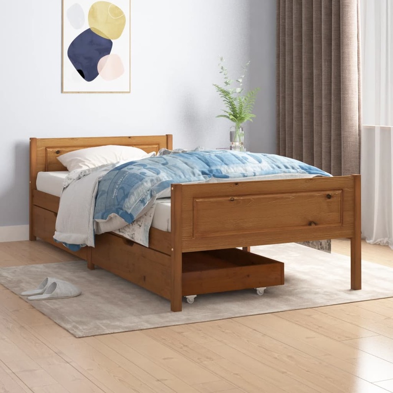 Featuring a simple yet timeless design, this bed frame with drawers will make a truly practical and decorative addition to your bedroom. Premium material: Solid pine wood is a beautiful natural material. Treat the surface with oil, wax, lacquer, or a glazing finish for a stronger surface and easy cleaning. Pine wood has a straight grain, and the knots give the material its signature, rustic look. Sturdy slats: The plywood slats provide good weight distribution, ensuring that the mattress stays in place with every twist and turn of your body during sleep. Drawers for storage: The spacious drawer allows you to keep your things organised. The easy-glide wheels can work on both carpeted and wooden floors. Note:The delivery includes a bed frame only. The mattress is not included. You can check our shop for the matching mattresses.