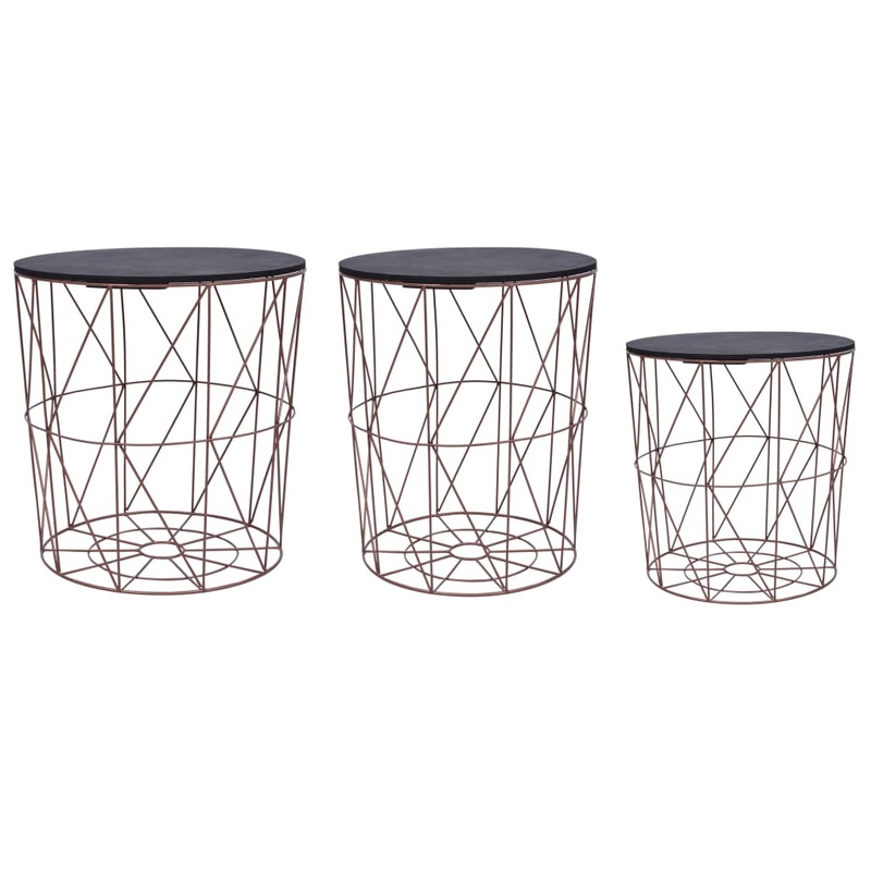 This set of 3 coffee tables exudes a vintage charm and will make a distinctive addition to your home decor. They can also be used as storage baskets, couch tables, side tables, etc. The solid wood tabletop provides a smooth and stable surface on which you can place drinks, vases or other decorative items. By removing the top, you can turn the side table into a storage basket. Moreover, the smaller table can be placed inside the larger one to save space. The strong powder-coated metal frame adds to the robust construction as well as an industrial look.