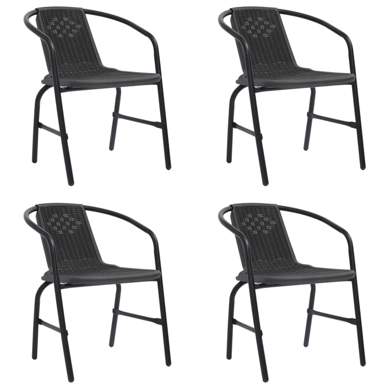 The garden chair set with rattan look is suitable for having your meals or just relaxing in the outdoors. Sturdy frame: Thanks to the steel frame, the outdoor chairs are stable and sturdy.Stackable chair: These armchairs are stackable to save space when not in use.Comfort seating: These patio chairs are made of plastic rattan, which add to seating comfort.Note:In order to extend the life of your outdoor furniture, we recommend you clean it regularly and do not leave it outdoors without protection unnecessarily.Clean: Use a mild soap solutionStoring: If possible, store in a cool, dry place indoors. If the product is stored outdoors, protect it with a waterproof cover. Wipe and dry the excess water or snow from flat surfaces after a rain or snowfall. Allow sufficient air circulation to avoid moisture-related damage.