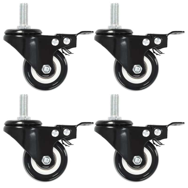 This set of 4 swivel casters with brakes will be the perfect accessory for small equipment and furniture like workbench, trolley, coffee table, plant stand, bookshelf, shopping cart, etc. These casters are made of PU (polyurethane) which is distinguished by a good shock and vibration resistance, enabling these casters to run smoothly and quietly. Additionally, their soft surfaces effectively protect your floor from scratching. Besides, the iron frame is highly rust-resistant and thus adds to the catser’s sturdiness and durability. Additionally, these swivel casters are equipped with brakes for flexible control. Each caster has a maximum loading capacity of up to 50 kg. Delivery includes 4 swivel casters with brakes.