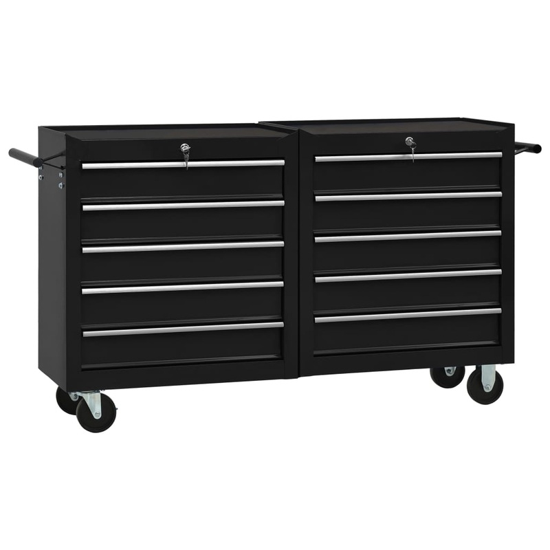 Use this spacious and flexible tool trolley with 10 sliding drawers to store and organise your tools. Made of sturdy steel, the workshop tool trolley has a robust and durable construction. Thanks to the integrated locks, drawers can be locked at once to prevent them from opening accidentally when the trolley is moved. Each drawer has a non-slip bottom lining to keep your tools in place. The robust countertop on the tool box is a great spot to keep frequently-used tools within reach. With four swivel castors, two of which have brakes, the trolley can be moved around easily. There are two convenient side handles for pushing the trolley. Delivery also contains keys and mounting accessories.