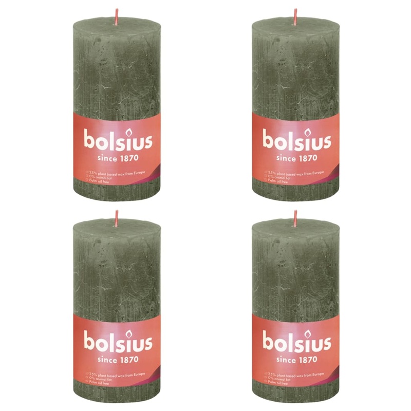 Bring a romantic glow with these fresh olive rustic Shine pillar candles from Bolsius! This basic colour combines beautifully with all the other colours from the Bolsius collection. The Shine candles collection is inspired by colours and textures from nature and produced without palm oil or animal fat. They are made with a plant-based wax from Europe, have a cotton wick, and an eye for people and the planet! The candles burn beautifully with no soot or smoke. Each has a burning time of 60 hours. Delivery includes 4 pillar candles.