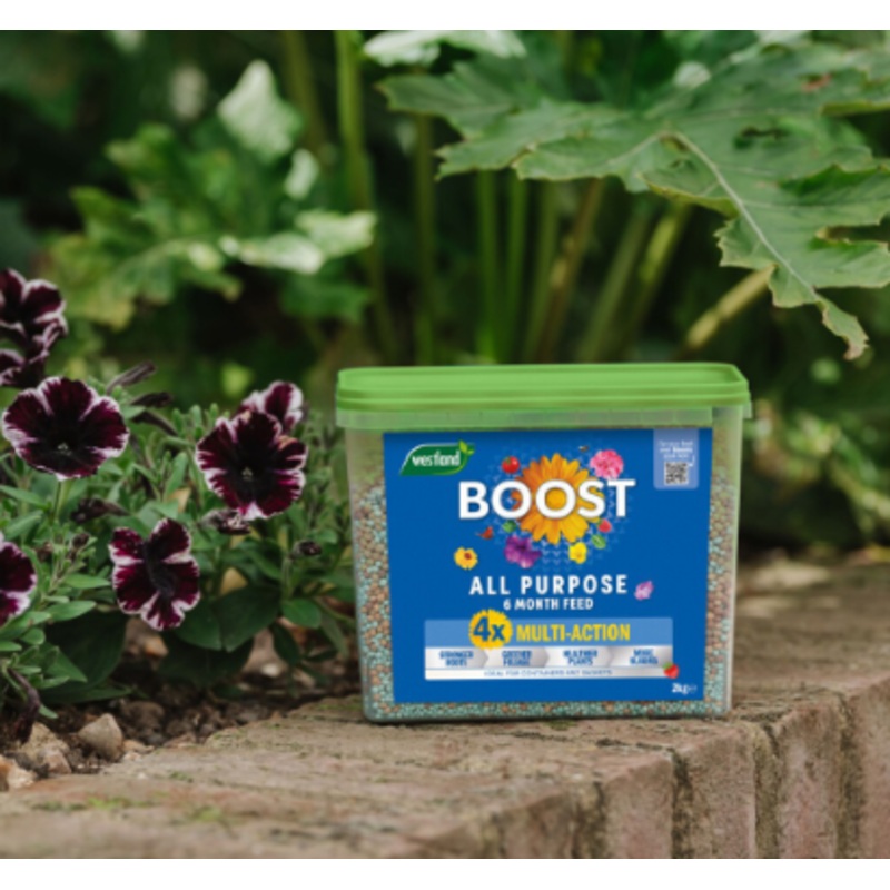 Westland Boost All Purpose Multi-Action Granules offers a 4x multi-action formula that supports your plants at every stage of growth. These nutrient-packed granules strengthen roots, promote greener foliage, and provide up to 6 months of slow-release feeding to enhance overall plant health. With its high potassium content, youll enjoy more blooms, fruits, and vegetables throughout the growing season. For best results, simply mixBoost All Purpose Multi-Action Granules intoBoost All Purpose Compostat planting, and continue with regular feeding usingBoost All Purpose Liquid Plant Feedto achieve 4x more blooms* all summer long.