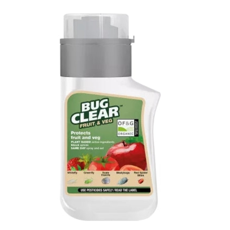 Main product features Plant based active ingredients Kills aphids Same day spray and eat Approved for use in organic systems BugClear Fruit & Veg concentrate controls aphids, mealy bugs, red spider mites and other mites. It is ideal for use on fruit and ve