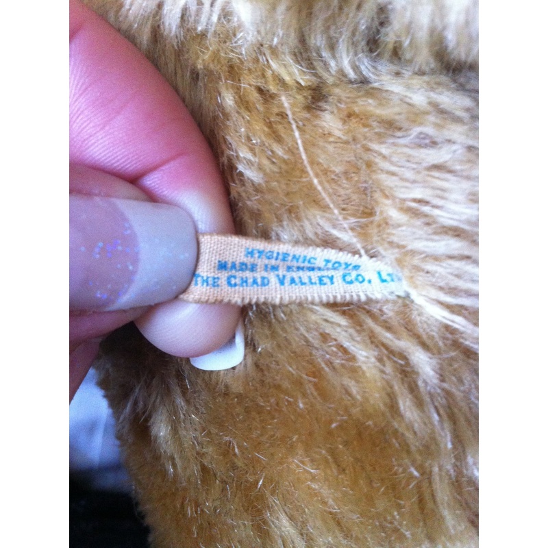 Card swing tag Description Date 1950s Make Chad Valley Button Label Printed Seam Label Fabric Various Size Various Eyes Glass or plastic Features Jointed Pads Stuffing Various Clothes Growl Number