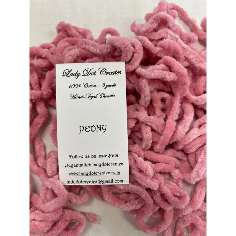Particulars: Hand-Dyed Jumbo Chenille, 100% cotton, 3 plus yards presented in a glassine bag.