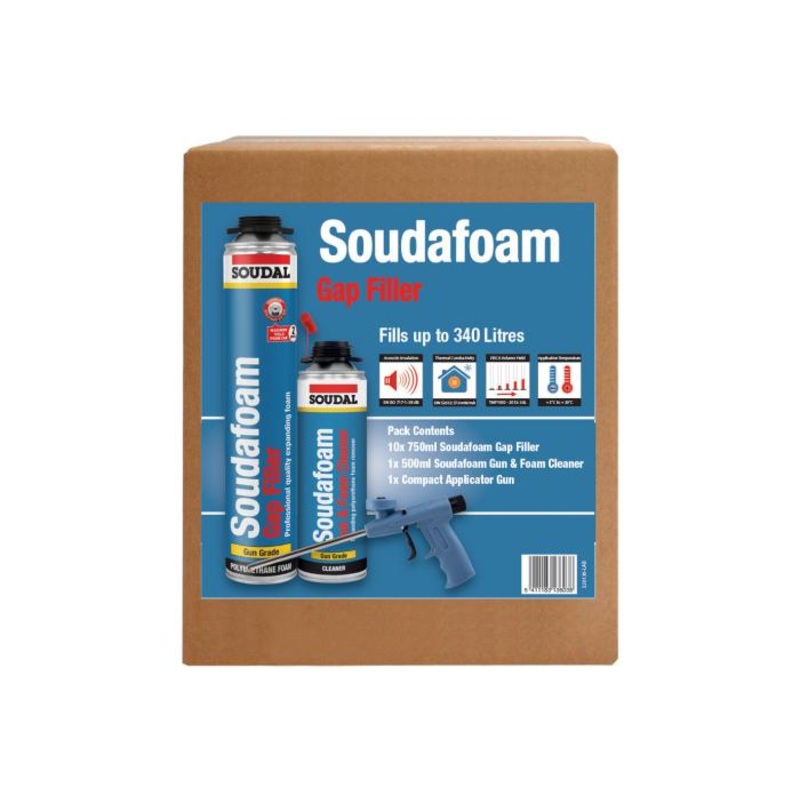 Soudafoam Gap Filler Multi-Pack containing 10 units of Soudafoam Gap Filler Gun Grade 750ml, applicator gun and clean after use.