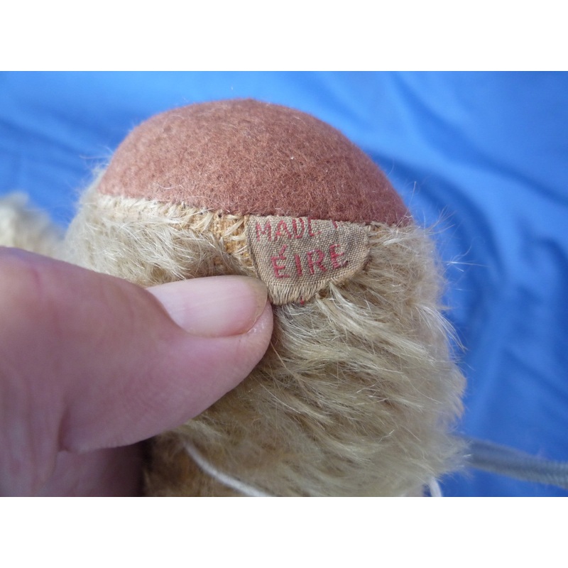 This is a 1940s Erris Toys Label. Red embroidery on white. This company became Tara toys in 1953 Description Date 1940 Make Erris Toys Ireland Button Label Foot Fabric Mohair Blond Size Eyes Glass Features Jointed Fully Jointed Pads Stuffing Woodwool Cloth