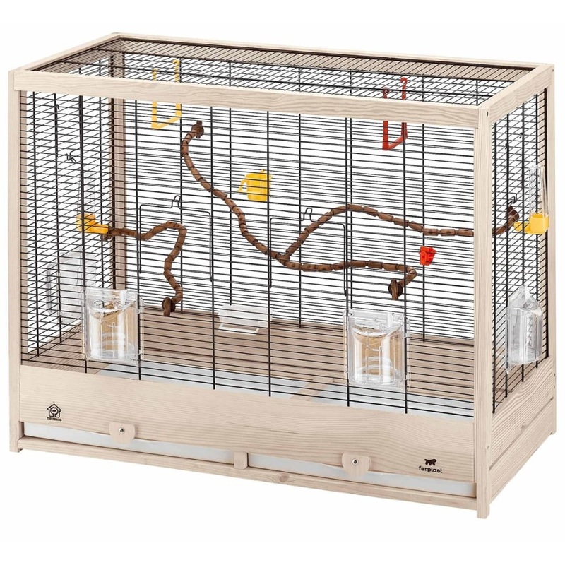 This Ferplast birdcage Giulietta 6 is ideal for canaries and other small exotic birds. The Giulietta is a wooden bird cage with a basic, functional design. The wood has been treated with a special, very durable, non-toxic waterproof white paint. The birdcage has been designed with a deep wooden base with a removable plastic tray for easy and fast cleaning. This model is delivered with various accessories: 5 removable rotating feeders, 2 drinking bottles, a food clip for vegetables and fruit, a snack bowl, 2 swings, as well as 2 flexible plastic perches. The wooden stand in the pictures is optional and not included in delivery.