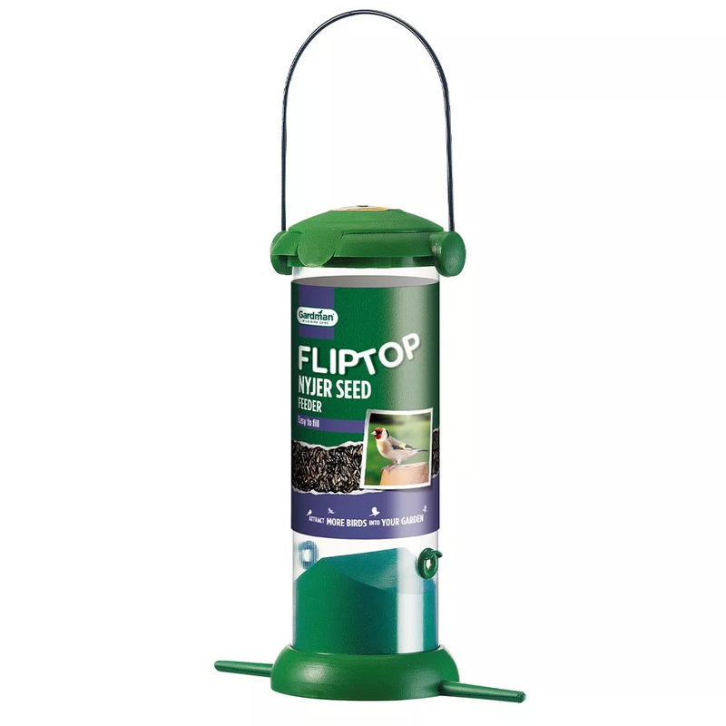 A durable, plastic feeder designed for nyjer seed. With its flip top lid you can fill and clean this feeder with ease. Flip top lid for easy filling and cleaning One-handed open Approx. Seed capacity: 240g Nyjer Seed