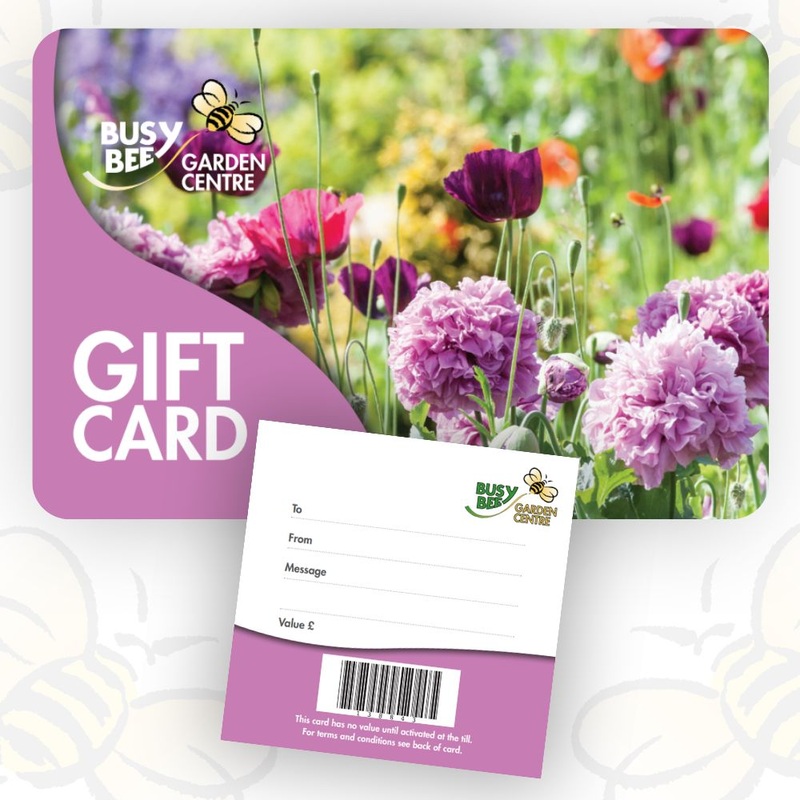 The perfect gift for any gardener. Our Busy Bee Gift Cards can be spent throughout the store including the Olive Tree Restaurant.3 designs of card to choose from.Not to be used for purchase of car gas, gift vouchers or concessions ( Klass & Julian Charles)