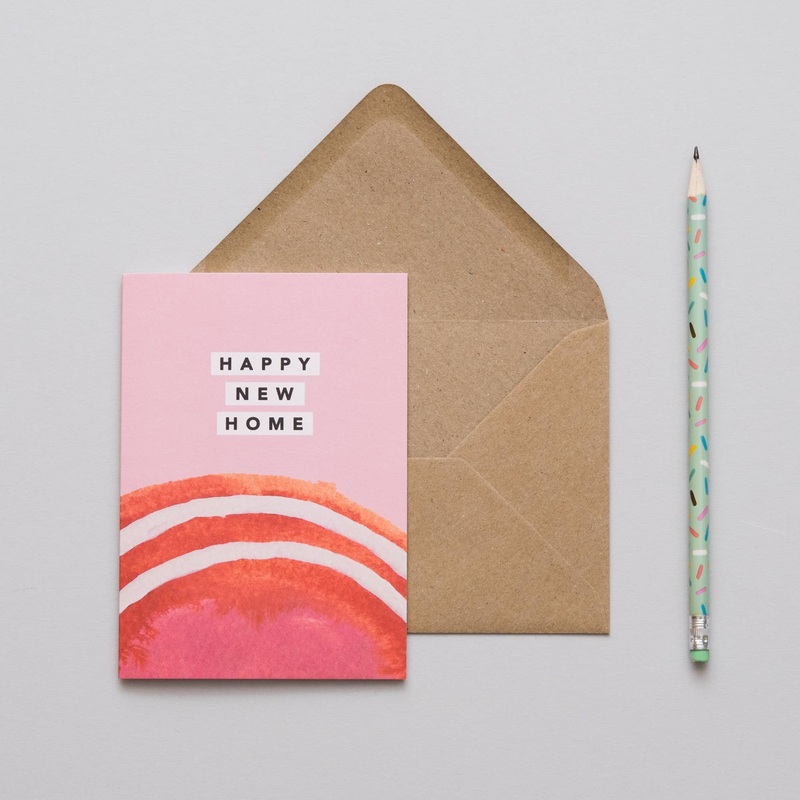 This luxury card features the phrase 'happy new home' on a pink and coral abstract watercolour background. PRODUCT DETAILS: A6 size. Blank inside. Comes with a recycled Kraft envelope. Printed in the UK onto luxury 350gsm card. Cardstock made in the UK.