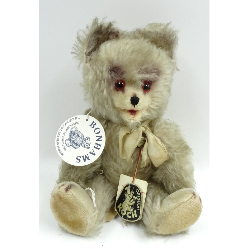 Hugo is a Hugo Koch bear made in the 1960s with his original paper tag/label.with white mohair, red and black glass eyes, short mohair muzzle with open felt mouth and black stitched nose, some black airbrushing, swivel head, jointed limbs with felt pads, original ribbon and black and gold swing tag 11 1/2in. (29cm.) high (dusty); this bear was sold by Bonhams on the 1st March 1995 as part of the Cotswold Teddy Bear Museum; and this actual bear appears on page 117 of The Teddy Bear Encyclopaedia, sold with the Bonhams lot tag and retail tags for Teddy Bears of Witney