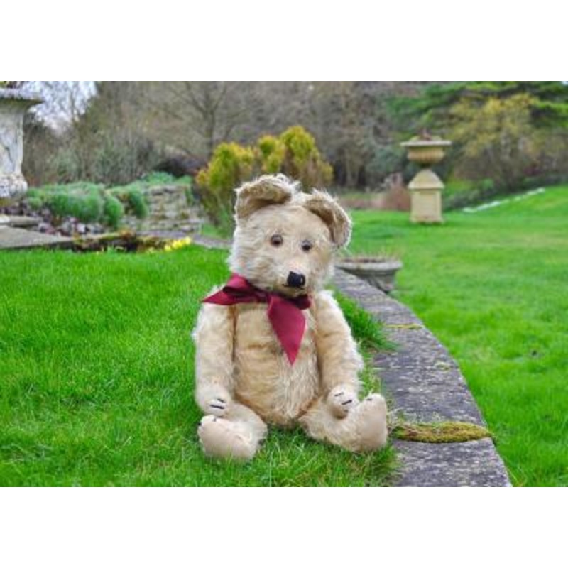 Bruno a Jopi teddy bear 1930s,with pale golden mohair, clear and black glass eyes with brown backs, pronounced muzzle, black stitched nose, mouth and three claws, swivel head, jointed limbs with felt pads, hump and inoperative growler 21in. (53.5cm.) high