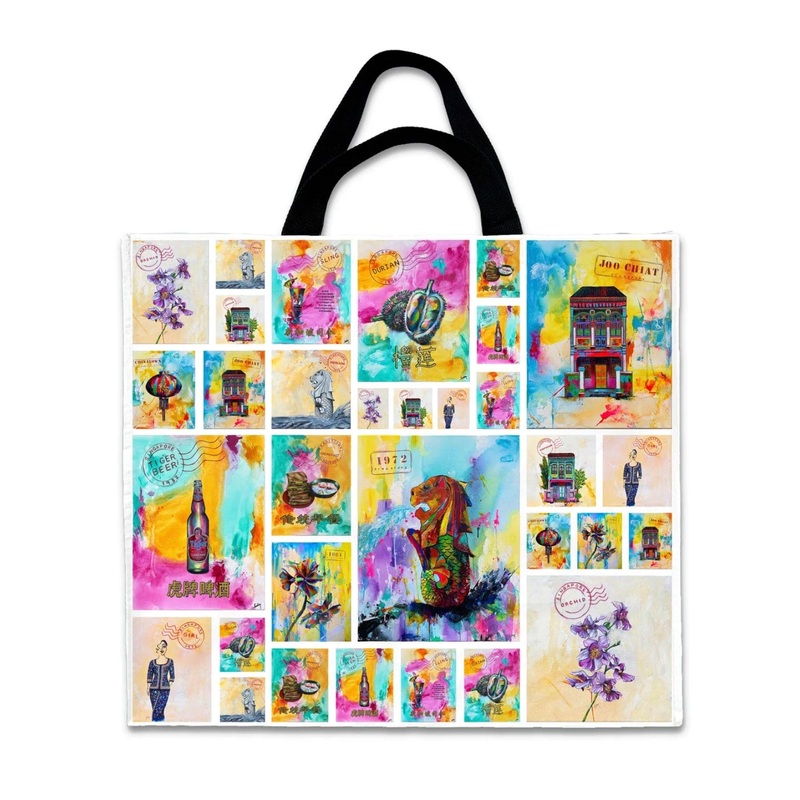 Add an artistic flair to your shopping experience with this sustainablegrocery bag made from recycledplasticthat features artworks fromthe Not Just a Little Red Dot and ‘Singapura’ collection by Singaporean artist Kelly Ser.