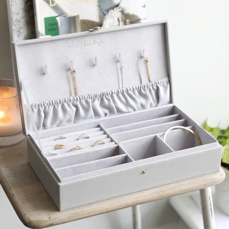 Store your treasured jewellery and accessories in this classic box. It boasts a large sized faux leather exterior with a gorgeous rose gold popper. Open the box to discover velveteen ring rolls, open sections and hooks for keeping pieces safe and secure. A