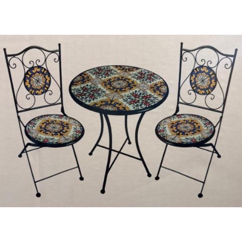 This vibrant bistro set is perfect for enjoying your outdoor space. With its intricate table top, seats and chair backs you can enjoy your garden seated in style. Plus with its foldable chairs, this set provides easy storage when required. Perfect for enjo