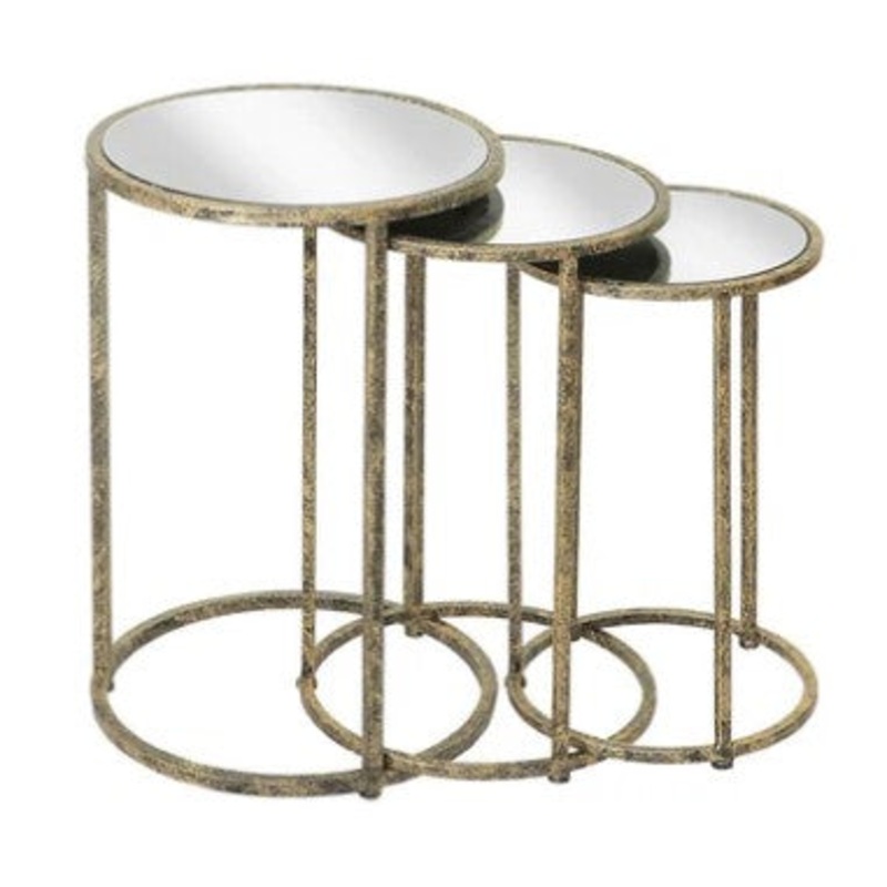 This elegant set includes three pod tables designed to stack neatly on top of one another, rather than sliding into each other.Finished in an antique gold colour with a mirrored top, these tables are a stunning addition to any home. A practical and stylish