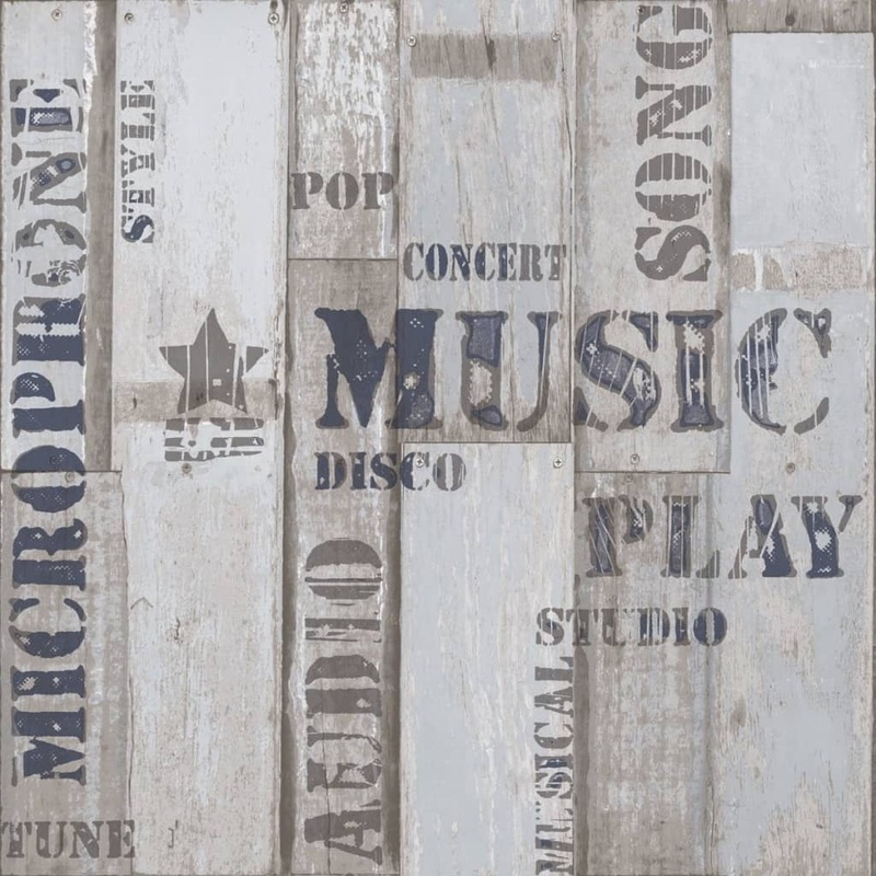 Noordwand Urban Friends & Coffee Wallpaper Wooden Planks Words Blue and Grey