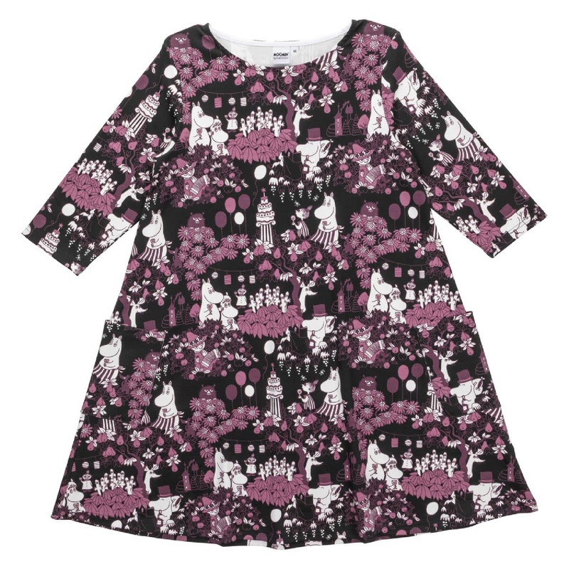 Meet autumn in style with this a line dress with a delicate rounded neck. The dress comes in shades of plum and black, has sleeves and two side pockets. The fabric features the Party moment print, with plum-coloured and white details. Materials: 48% cotton