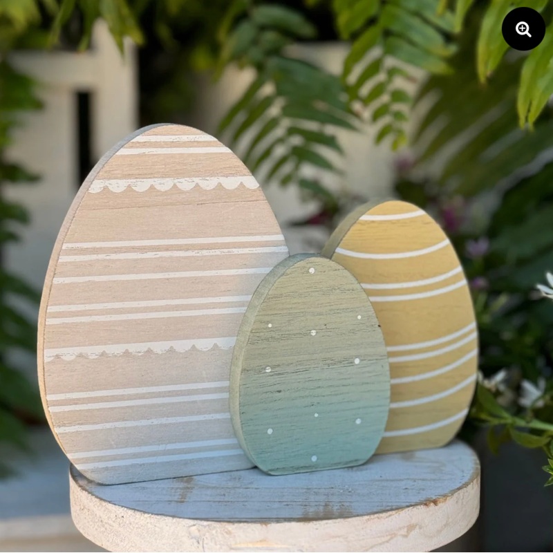 Pattern Egg Trio White Washed Wood Egg with White Stripe Pattern, Sage Washed Wood Egg with White Polka Dots, and Yellow Washed Wood Egg with White Stripe Pattern - layered together 6 1/2" W x 5 1/4" T x 1" D (overall)