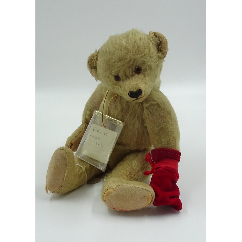 Virgil a rare Aetna teddy bear circa 1906,with blonde mohair, orange and black glass eyes, pronounced muzzle, black stitched heart shaped nose and mouth, swivel head, jointed elongated limbs with felt pads and card lined feet, hump, inoperative squeaker and a piece of paper attached Virgil Xmas 1906 which appears to be in an elderly hand 12in. (30.5cm.) high (balding to right arm, general wear and thinning, large hole in left hand pad and some damage to other pads)