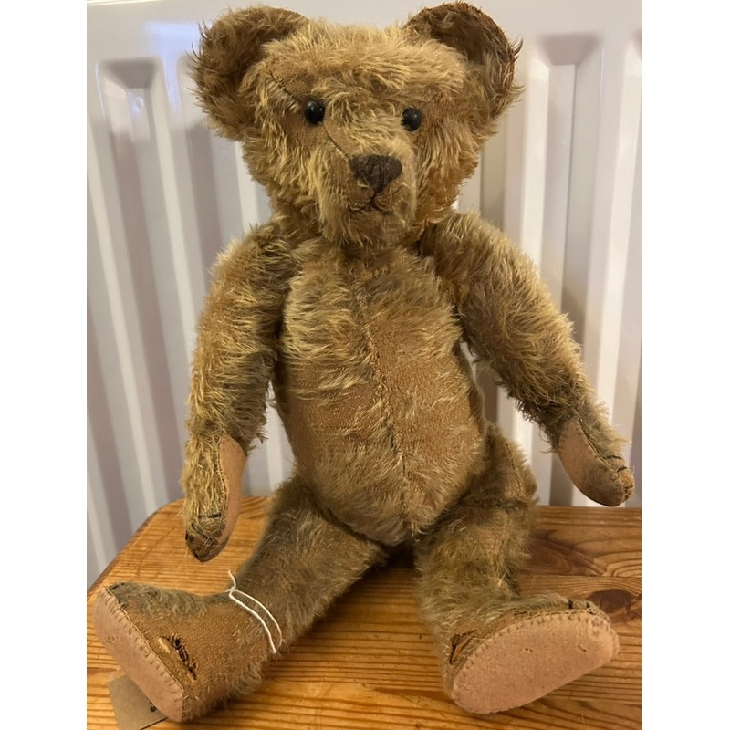 Nellie is in good condition for her age. She has a reasonable covering of blond mohair and a pronounced snout. Her paws and pads are in very good order. A pretty bear. Description Date 1907 Make American Aetna Fabric Mohair blond Size 14 ins Eyes Boot Butt