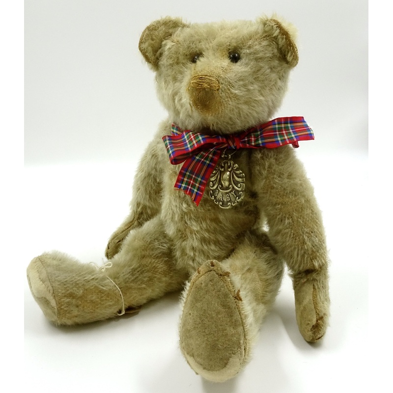 This gorgeous old boy dates c1907 and has a fabulous expression. There is some overall wear to the cream mohair and he has had some professional restoration to the pads. Ted is filled with wood wool and has a non-working side bellows squeaker in his tum. H