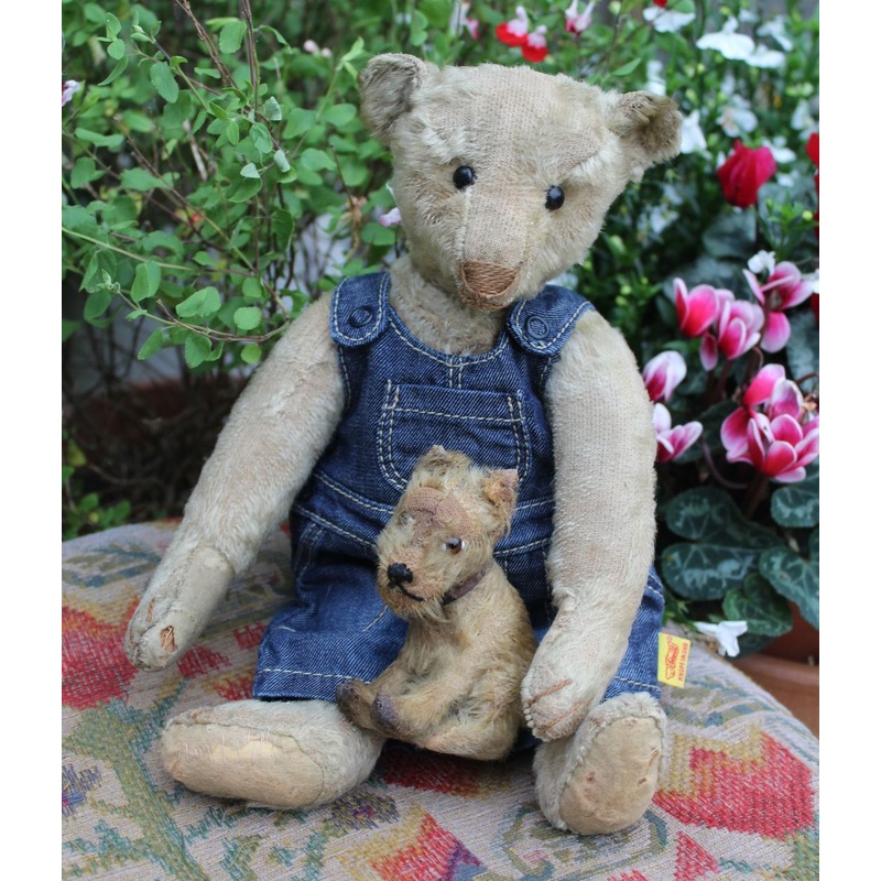 Humbug is a 1907 white Steiff who measures 13" no longer has his button. He is an original pinky beige with a stitched nose and mouth. His mohair has faded over the years and he has some repairs but remains a very strong old boy. He comes wearing his Steif