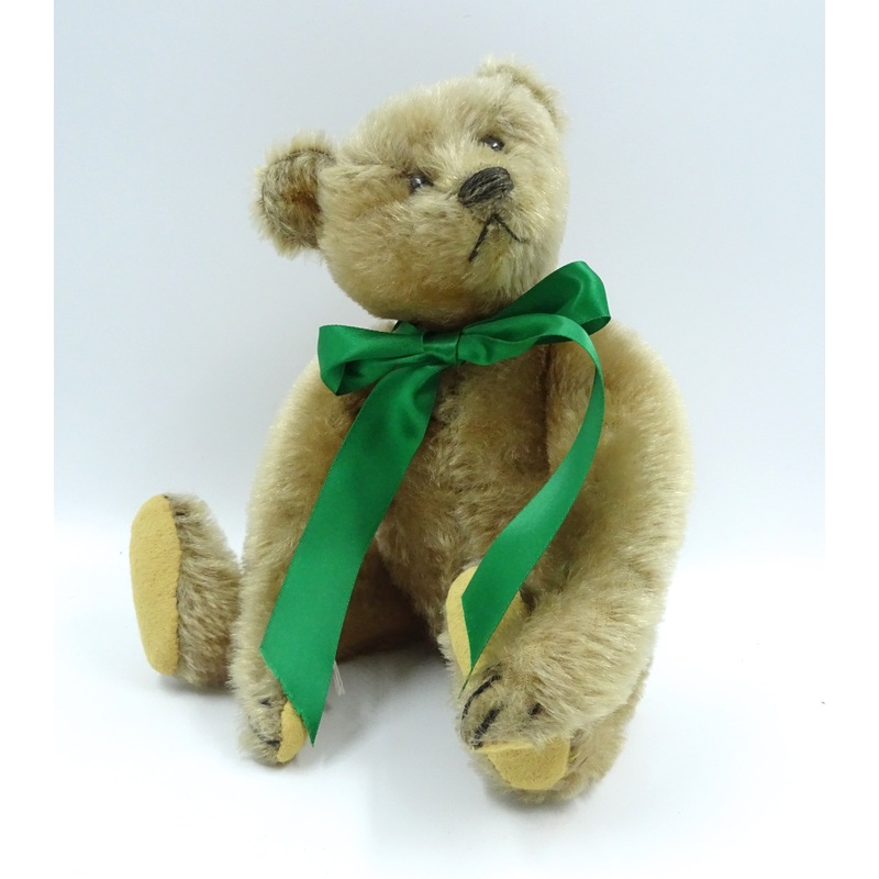 Muffin an early Steiff teddy bear circa 1908with golden mohair, black boot button eyes, black stitched nose, mouth and claws, swivel head, jointed elongated limbs, hump, part soft stuffed and inoperative squeaker 12 1/2in. (32cm.) high (mohair pads replace