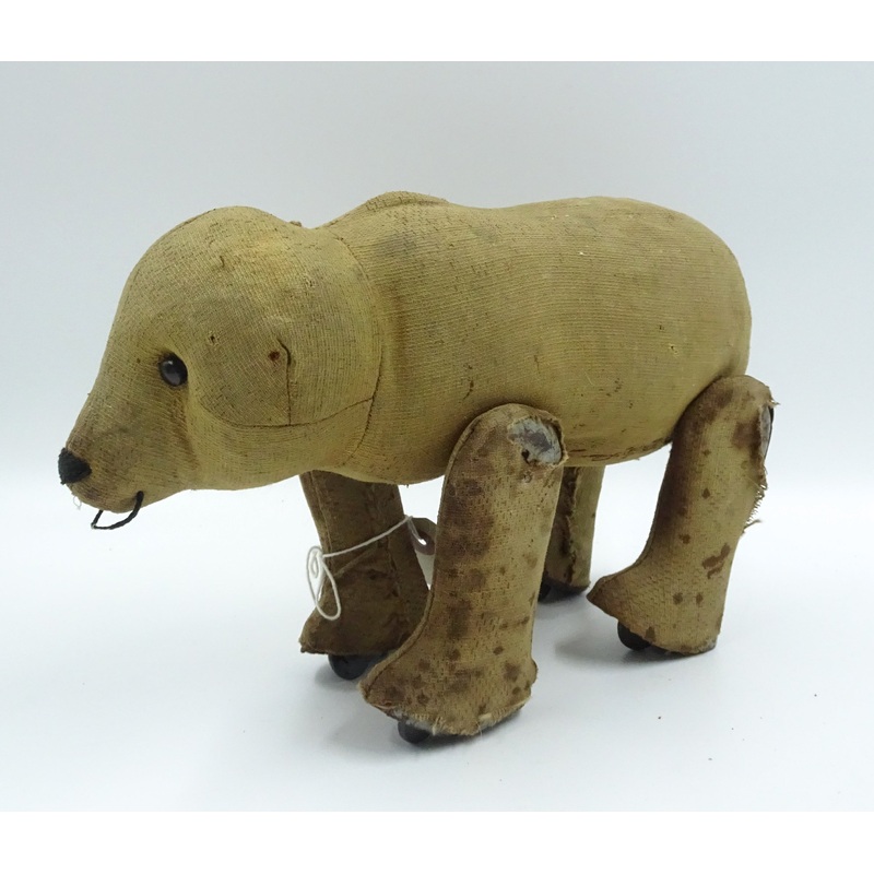'Tripple' a Bing Tripple Trapple walking bear 1910 with remains of brown mohair, black boot button eyes, black stitched nose and mouth, tinplate legs with wheels and pull-along walking mechanism 11 1/2in. (29cm.) long (completely bald, missing ears, damage