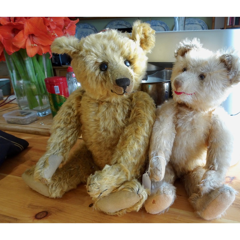 This is Milton a 22" Steiff Teddy Bear c.1910 with his underscored F Steiff button in his ear. He is a really strong and handsome bear. He has a good mohair cover of 95% and boot button eyes. He has a shaved muzzle. All his joints work well. He is totally