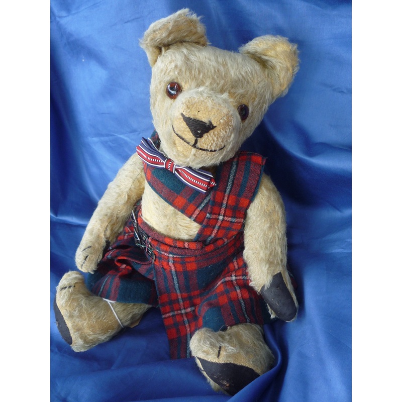 I’m selling one of my prized Smiles bears to make some more shelf room! I now have seven bears which are now generally accepted as being Chad Smiles bears. There was a postcard of a smiling little girl, a smiling doll and a smiling Chad bear like this one. These bears then became known as “Smiles bears”. Scott is a solid bear with nose from the very early experimental period Chad went through. One small stitch is missing. He sports an old kilt which covers his patchy mohair nicely. (There are 2 sharp dress pins in his kilt to keep it up, be careful!) He has the most amazing pointed toes! A rare and unusual bear.