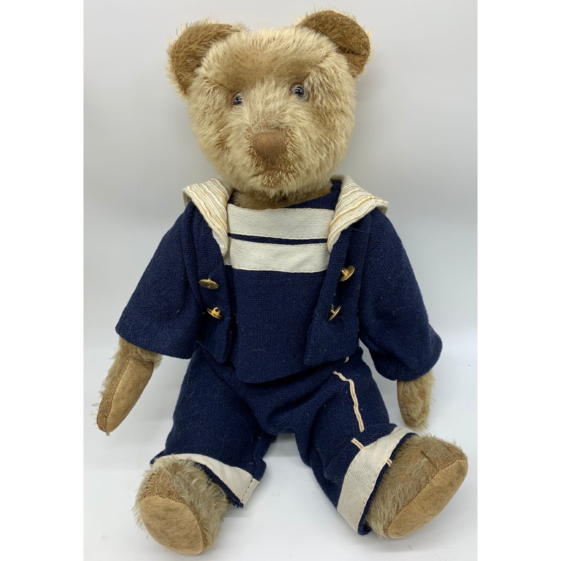 This 18 German bear is in excellent condition for his age.He will come wearing his vintage sailor top that looks adorable on him. Description Date 1920 Make Eduard Cramer Button Label Fabric Mohair Blond Size 18 ins Eyes Glass with painted backs Features J