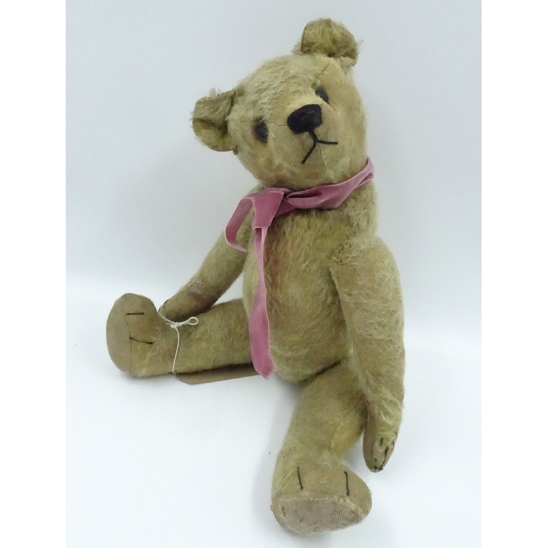 A 1920s teddy bear possibly French with blonde mohair, replaced black boot button eyes, pronounced muzzle, black stitched nose, mouth and claws, swivel head, jointed limbs with cloth pads, hump and inoperative growler 15 1/2in. (39.5cm.) high (balding, gen