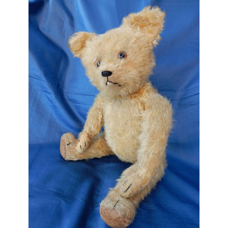 This is a lovely Teddy Bear. A Bear from the 1920s! A fantastic and rare Teddy Bear, with lovely painted back glass eyes and wide apart ears. He has blond mohair (around 80%), is hard stuffed with wood wool, a sharp nose, and is 5-ways jointed with long bent arms! The pads need work and have been covered in cotton, covering the felt. The paws are in original felt and are in a bad way. He has a lovely face and a fantastic expression!