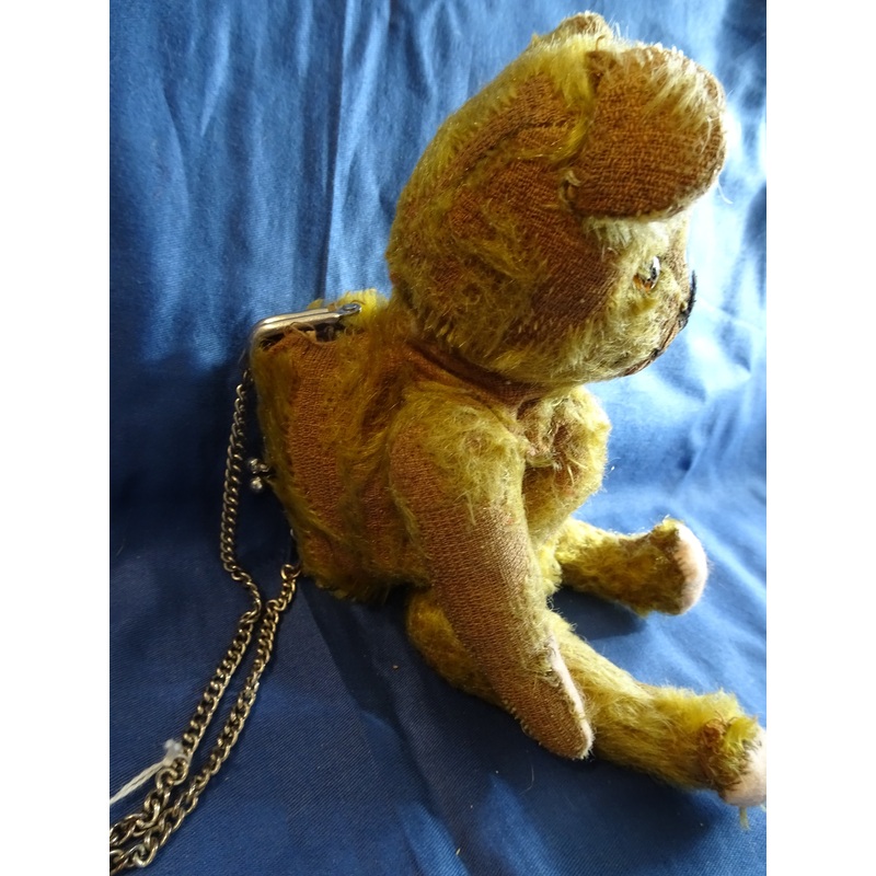 Pursey is a German teddy bear Purse with golden mohair, orange and black glass eyes, pronounced muzzle with black stitched nose and mouth, swivel head, jointed limbs, inoperative squeaker and back with metal framed purse opening and chain handle 10in. (25.