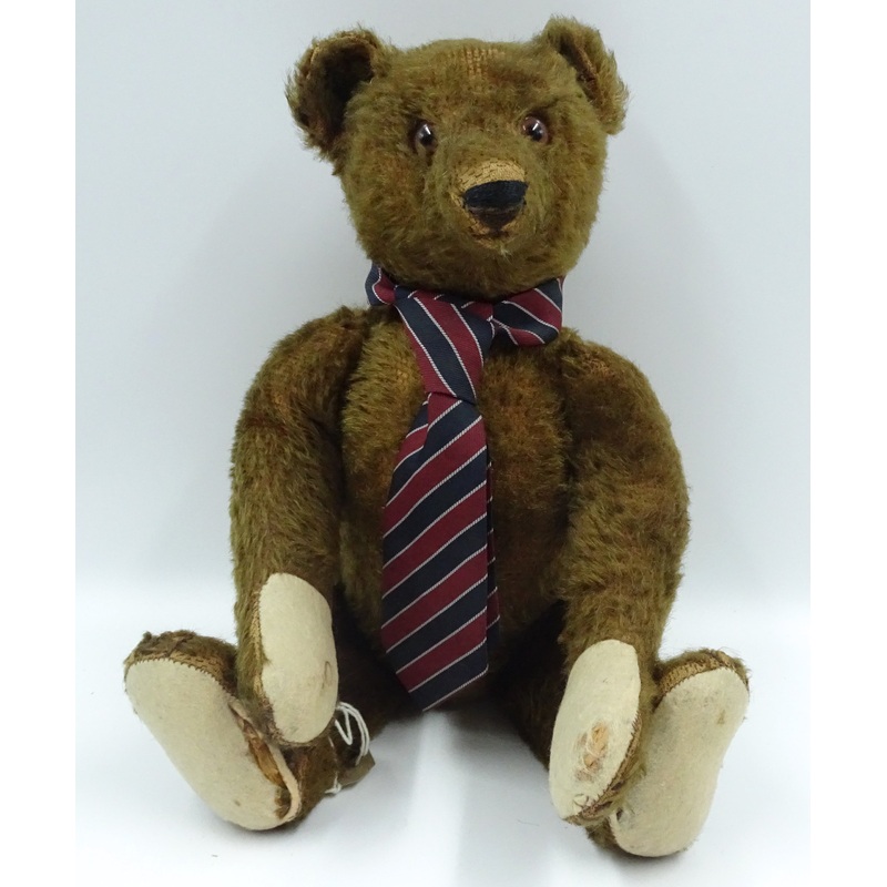 Brown Boy a 1920s Steiff teddy bearwith brown mohair, brown backed glass eyes, pronounced muzzle, black stitched nose, mouth and claws, swivel head, jointed elongated limbs with felt pads, hump, inoperative squeaker and school tie 13 1/4in. (33.5cm.) high (some slight wear, small holes to pads and hole where button has been removed) – this bear was sold by Special Auction Services in June 2017, lot 82