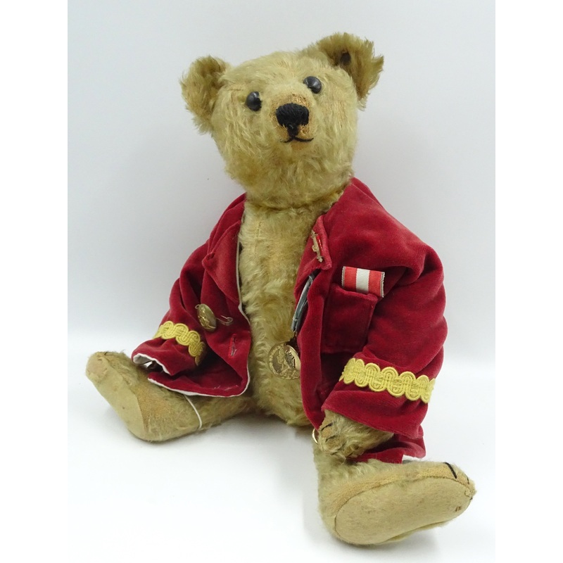 Colonel a Steiff 1920s teddy bearwith golden mohair, black boot button eyes, pronounced muzzle, black stitched nose, mouth and claws, swivel head, jointed elongated limbs with felt pads, hump, inoperative growler and FF underscored button 16in. (40.5cm.) high (eyes probably replacing glass, some wear and general thinning, small hole to top of muzzle, nose stitching replaced, three pads patched