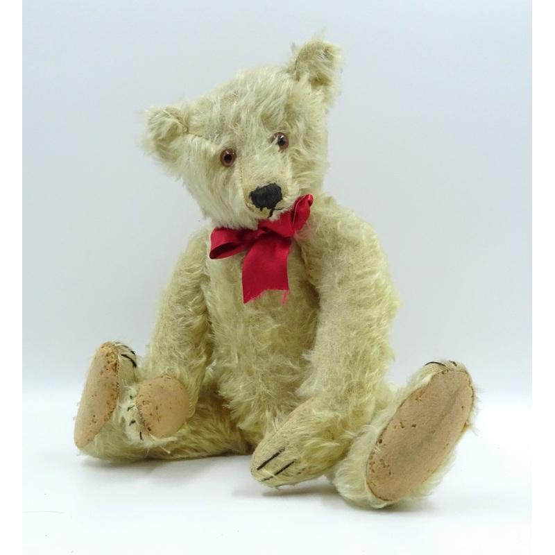 Hans a 1920s Steiff teddy bearwith golden mohair, brown backed glass eyes, pronounced muzzle, black stitched nose, mouth and claws, swivel head, jointed elongated limbs with felt pads, hump, inoperative growler and FF underscored button 16in. (40.5cm.) hig