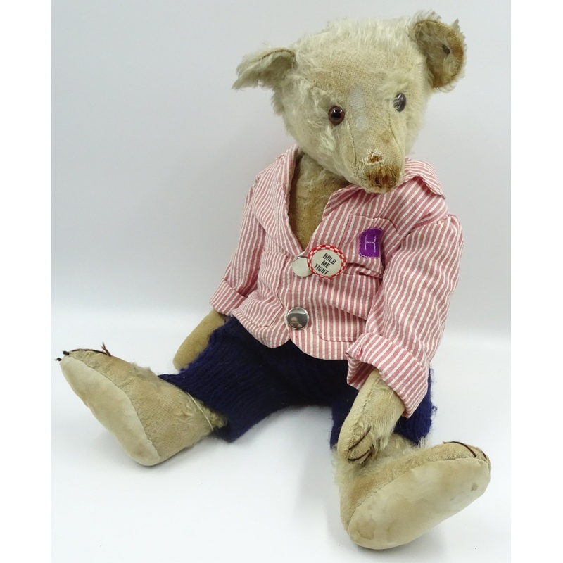 Penchant a 1920s Steiff teddy bearwith white mohair, pronounced muzzle, brown backed glass eyes, brown stitched nose and mouth, swivel head, jointed elongated limbs, hump and FF underscored button; with pink and white striped jacket with an H on pocket, a