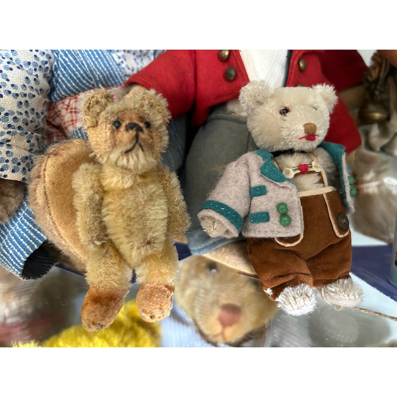Tiny tiny is a 3" Cramer teddy bear with blond mohair, clear and black glass eyes , tiny muzzle with black stitched nose and mouth, swivel head, jointed limbs. So sweet! Description Date 1920 Make Cramer Button Label Fabric Mohair blond Size 3 ins Eyes Gla