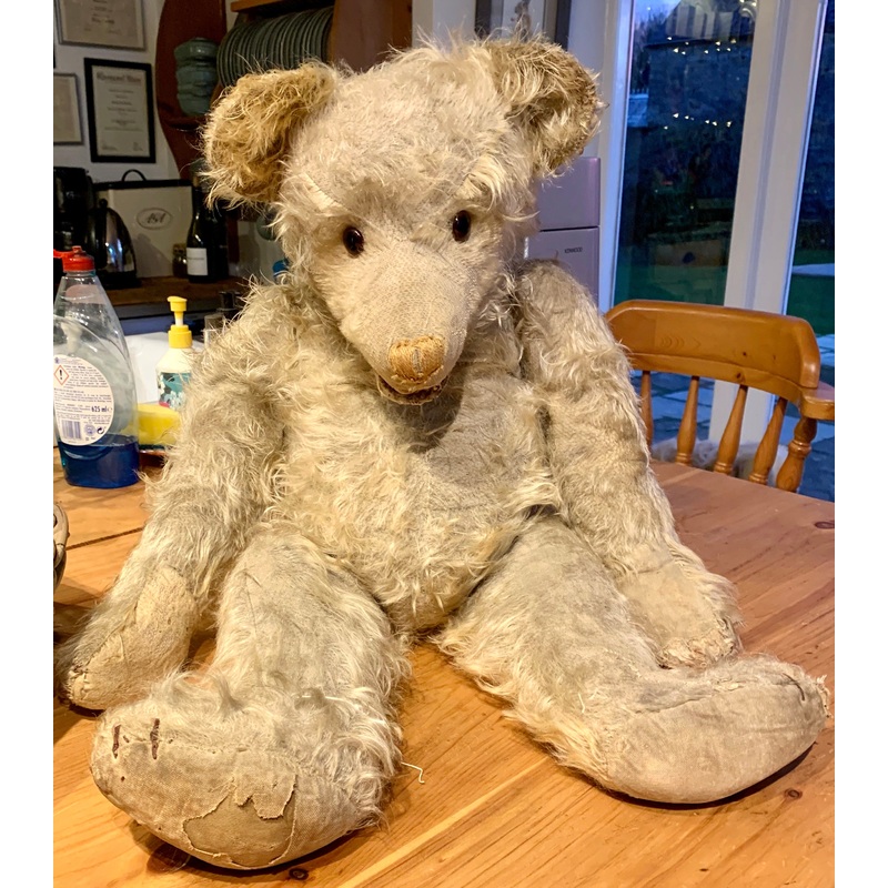This is a rare large 26" antique Eduard Cramer! (EDUCA) from around the 1930s with long cream mohair, orange and black glass eyes, inset heart shaped mask, pronounced muzzle with open mouth, light brown stitched nose and claws, swivel head, jointed limbs,