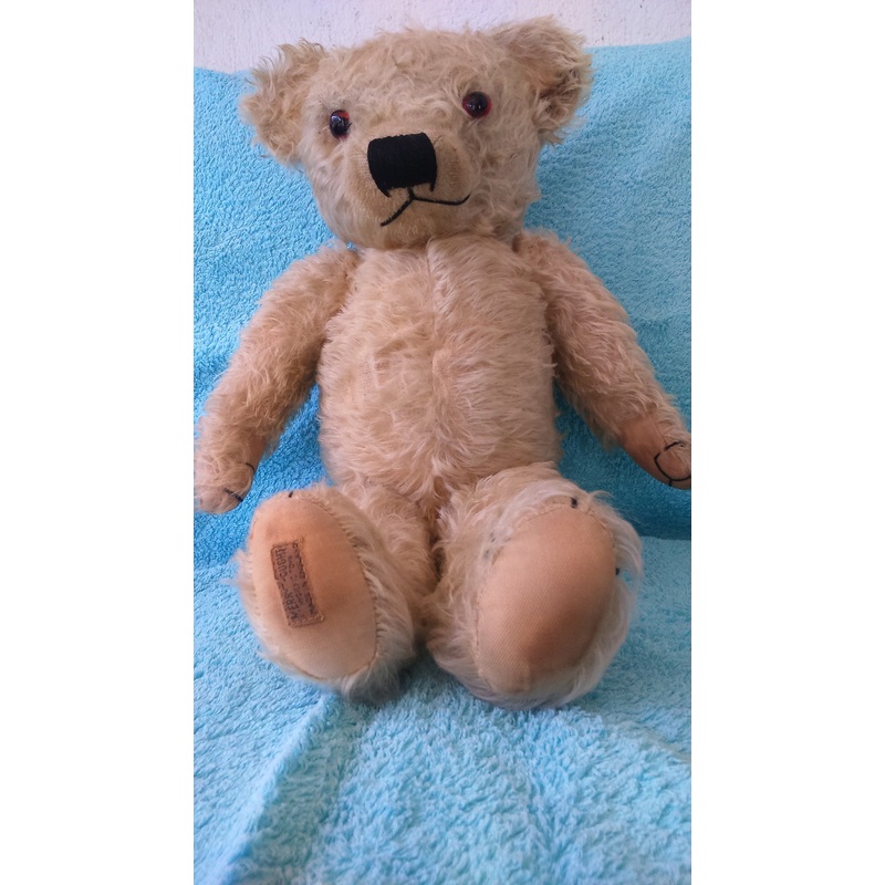 Ted is a beautiful early 1930s Merrythought teddy bear. He has his amazing Merrythought Wishbone button in his ear and the original early label on his foot which reads “Merrythought Hygienic Toys. Made in England”. He measures 20″ tall. He is fully jointed, has his original paw pads and webbed claws . He is stuffed with kapok throughout, except his head, which is wood wool stuffed. He has clear glass eyes with painted backs and his nose and mouth are stitched. He has lost some mohair over the years and is a bit patchy in places, but this does not detract from his beautiful face and the fact that he still has his early identification. Merrythought only started making bears in the 1930s, and only used this label and button on early bears, so this is one of their first pieces. He has been well loved. Ted is in Greece and will need international shipping to come to the UK.